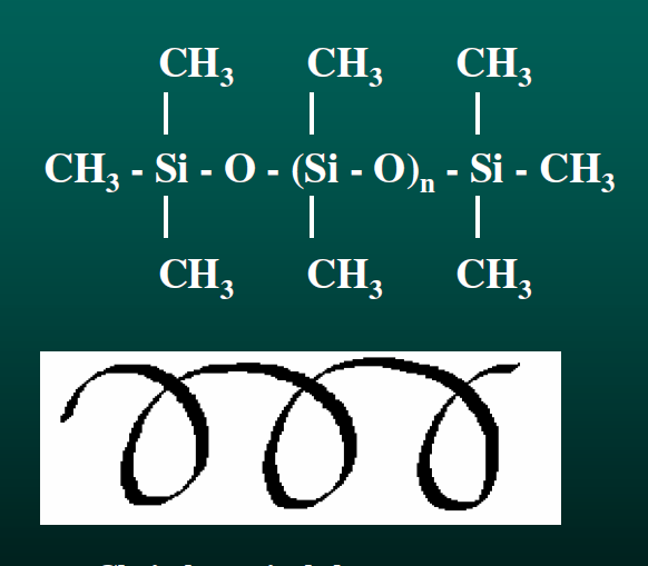 上次提到這個結構,有機和無機結合,但這次我們說一說這個Si-O-Si的結構是個螺旋形狀的,類似上圖中下麵的這個樣子,有人說,這玩意有意思,怎麼那麼像家裡的彈簧啊, 我隻能說,“真聰明”。矽油也叫“液體彈簧”,借用的就是這個結構。同時,所有的甲基就像甩出來的分子一樣,均勻的站在外部站崗,下圖再來一個。